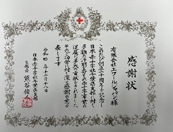 弊社は、「日本赤十字社」の理念と事業に賛同した活動を継続したことで、令和4(2022年)年の創立20周年時に感謝状を贈呈されました。